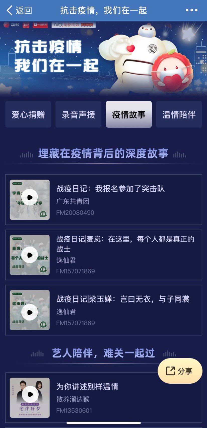 疫情之下,荔枝(LIZI.US)作為一家上市公司,積極履行社會責任,除了第一時間捐資贈物支持抗擊疫情一線醫護工作者和社區工作人員外,還充分發揮UGC聲音平臺優勢,廣泛發動平臺主播講故事、發聲援、辟謠言、做直播,用聲音為抗擊疫情作出行動。