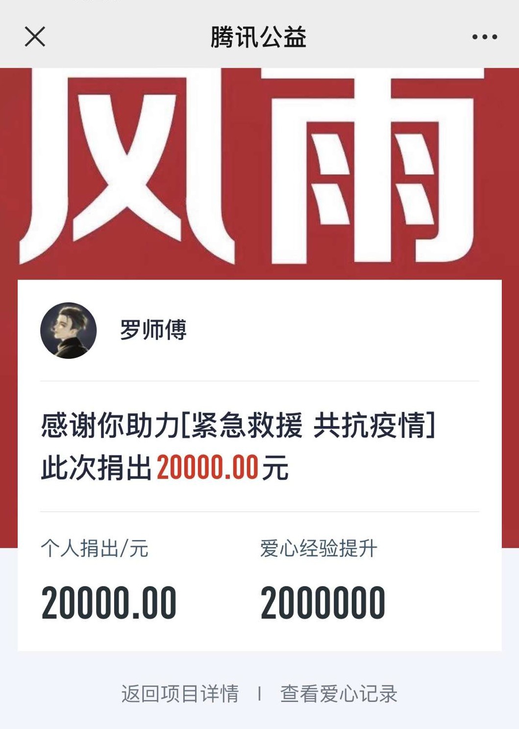 除了參與站內抗疫專題活動外,荔枝主播還自發通過捐款等形式來支持抗疫前線。如荔枝的頭部主播羅師傅第一時間向騰訊公益捐款20000元。“稍微盡點綿薄之力”,羅師傅表示。