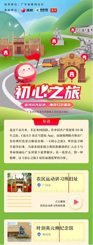 為充分滿足網絡用戶對紅色旅游的資訊需求,國內最大UGC音頻社區荔枝App聯合廣東省委機關刊《南方》雜志推出《初心之旅》紅色景區解說音頻,由網絡主播講解革命領袖在廣東的追夢故事,依托國內領先出行平臺高德地圖優勢共同打造紅色語音地圖。